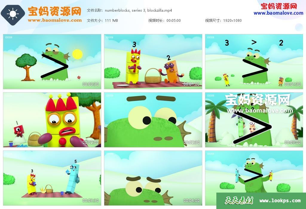 天天资源网收录的动画片《Numberblocks》数字积木英文版 第三季,全部30集,英语发音,外挂英文字幕;每集大小约110M,资源总大小3.25G,单集播放时长约5分钟,1080P高清MP4格式,可以在电视机或电脑、平板、IPAD、早教机、手机等各种设备播放,提供百度云网盘下载。