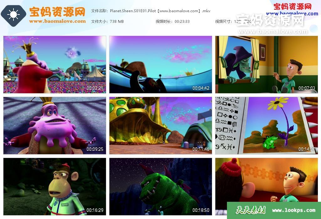 天天资源网收录的动画片《Planet Sheen》西恩的星球英文版 第一季,全部13集,英语发音,内置英文字幕(可以下载后使用播放器选择设置字幕或者关闭字幕);每集大小700M,资源总大小9.07G,单集播放时长约23分钟,720P高清MKV格式,可以在电视机或电脑、平板、IPAD、早教机、手机等各种设备播放,提供百度云网盘下载。
