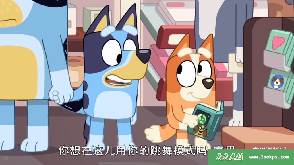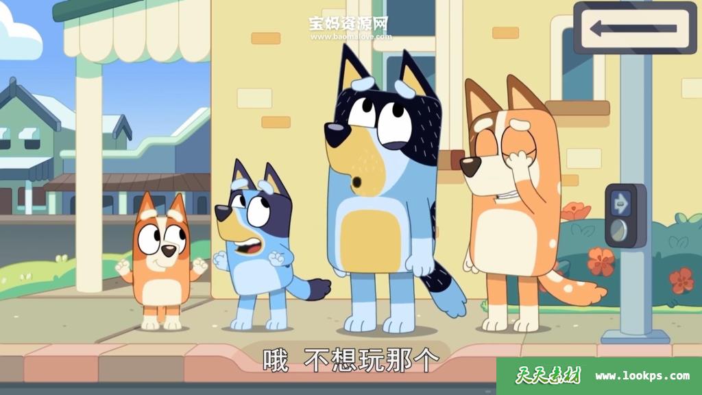 动画片主人公是“一家四狗”,爸爸Bandit,妈妈Chilli,以及姐姐Bluey和妹妹Bingo,妈妈在外工作,爸爸在家带娃。故事全部是日常生活,从中可以学到不少亲子游戏。