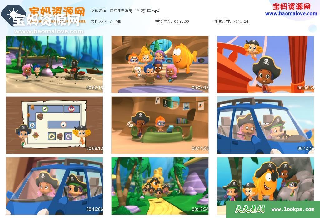 天天资源网收录的动画片《泡泡孔雀鱼》Bubble Guppies中文版 第二季,全部20集,国语发音,无字幕;每集大小约75M,资源总大小1.6G,单集播放时长约23分钟,480P标清MP4格式,可以在电视机或电脑、平板、IPAD、早教机、手机等各种设备播放,提供百度云网盘下载。