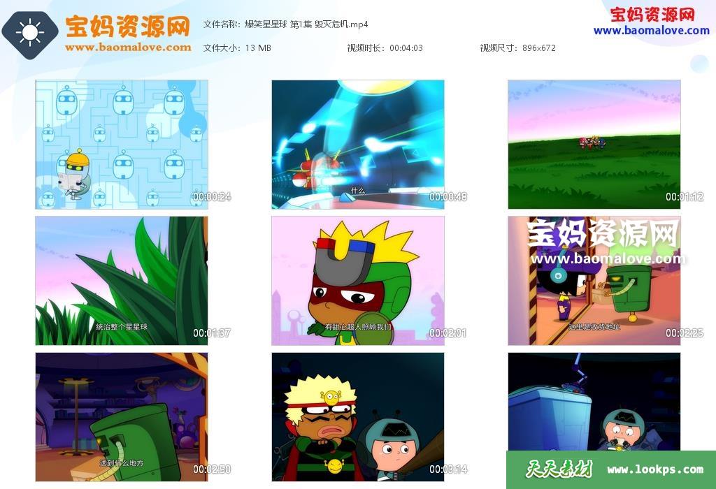 天天资源网收录的动画片《开心宝贝之爆笑星星球》,全部52集,国语发音,中文字幕;每集大小约13M,总大小698M,单集播放时长约4分钟,672P高清MP4格式,可以在电视机或电脑、平板、IPAD、早教机、手机等各种设备播放,提供百度云网盘下载。