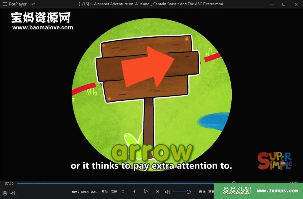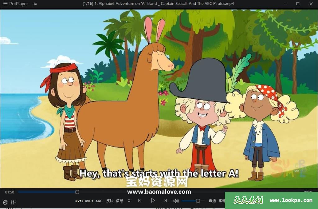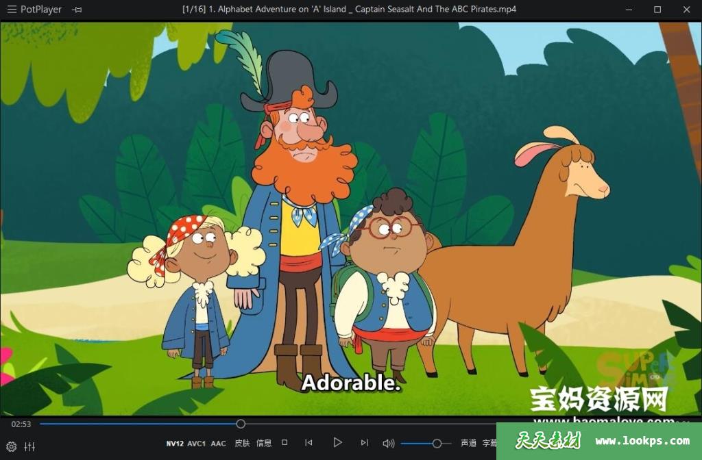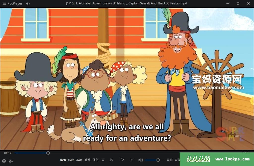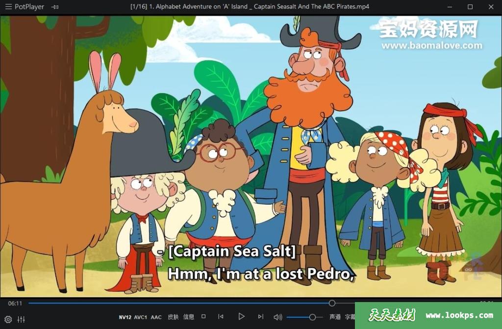天天资源网收录的动画片《Captain Seasalt and the ABC Pirates》海岸船长和ABC海盗英文版,全部26集,英语发音,外挂英文字幕;每集大小约75M,资源总大小2.22G,单集播放时长约8分钟,1080P高清MP4格式,可以在电视机或电脑、平板、IPAD、早教机、手机等各种设备播放,提供百度云网盘下载。