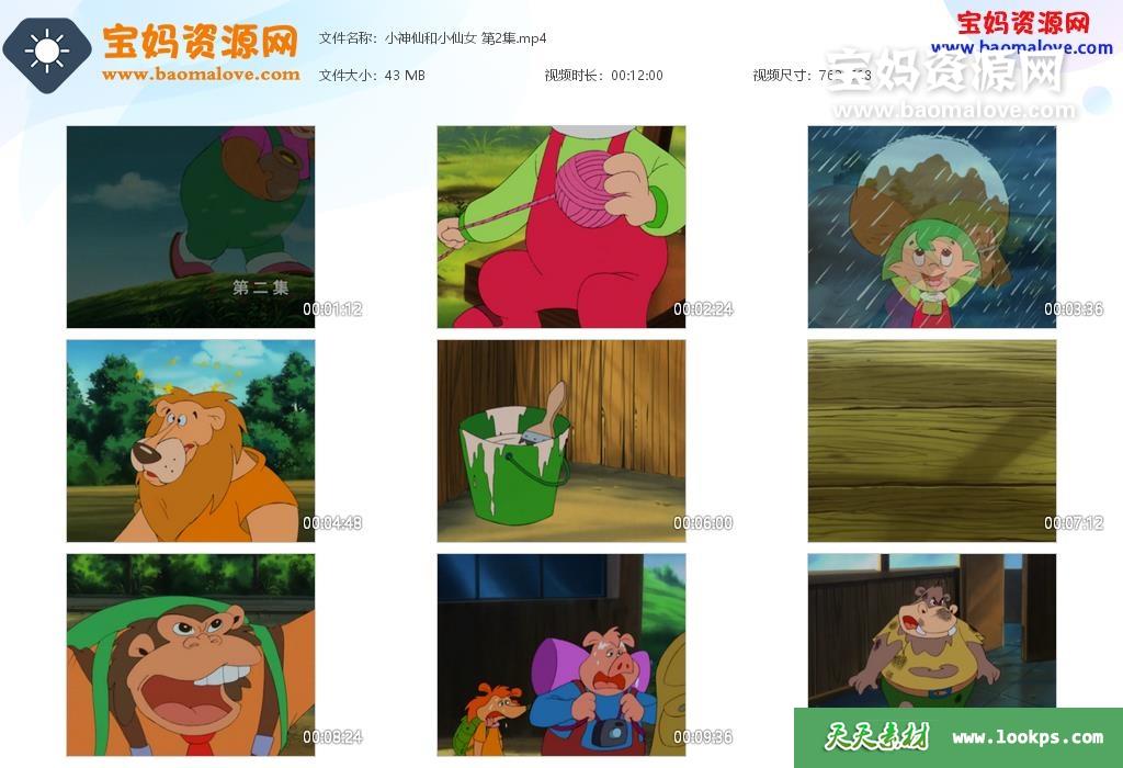 天天资源网收录的动画片《小神仙和小仙女》,全部104集,国语发音,无字幕;每集大小约45M,资源总大小4.88G,单集播放时长约12分钟,480P标清MP4格式,可以在电视机或电脑、平板、IPAD、早教机、手机等各种设备播放,提供百度云网盘下载。