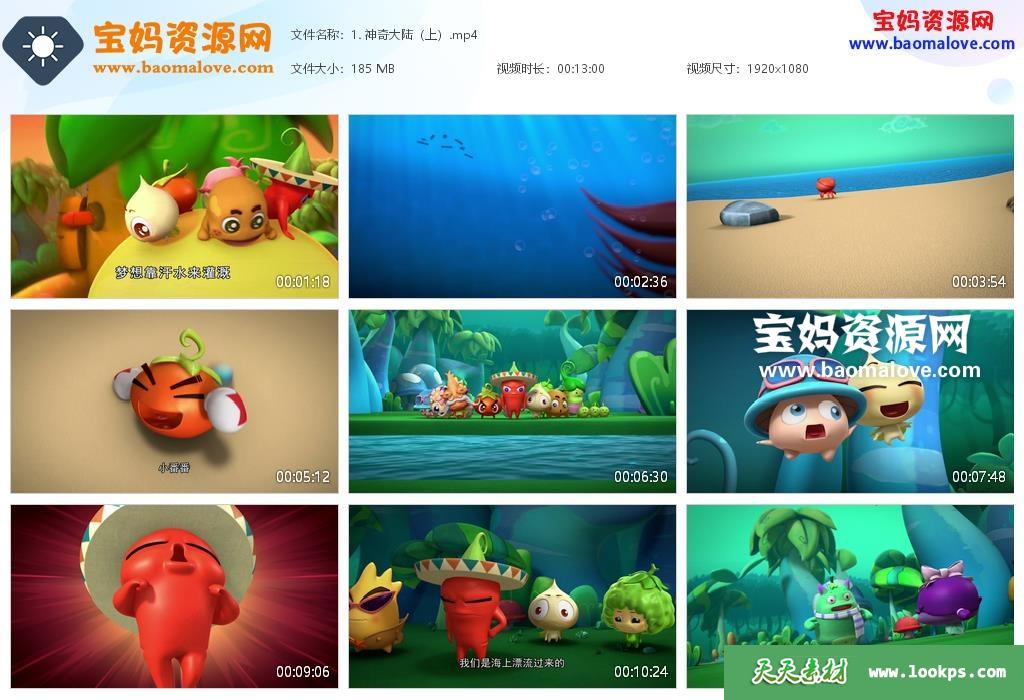 天天资源网收录的动画片《燃烧的蔬菜之神奇大陆》,全部26集,国语发音,中文字幕;每集大小约160M,总大小4.05G,单集播放时长约13分钟,1080P高清MP4格式,可以在电视机或电脑、平板、IPAD、早教机、手机等各种设备播放,提供百度云网盘下载。