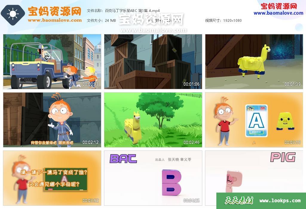 天天资源网收录的动画片《百变马丁字乐星ABC》,全部26集,国语发音,中文字幕;每集大小约100M,总大小2.75G,单集播放时长约5分钟,1080P高清MP4格式,可以在电视机或电脑、平板、IPAD、早教机、手机等各种设备播放,提供百度云网盘下载。