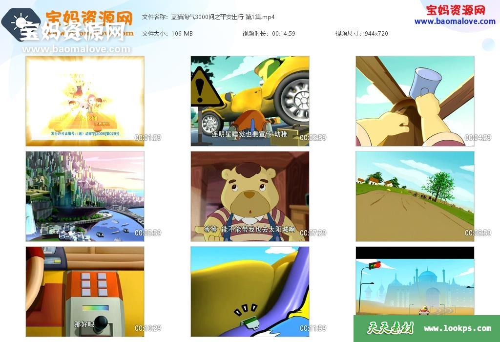 天天资源网收录的动画片《蓝猫淘气3000问之平安出行》,全部108集,国语发音,中文字幕;每集大小约160M,资源总大小15.6G,单集播放时长约15分钟,720P高清MP4格式,可以在电视机或电脑、平板、IPAD、早教机、手机等各种设备播放,提供百度云网盘下载。