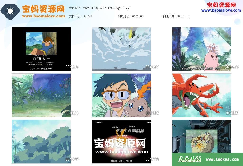 天天资源网收录的动画片《数码宝贝》第一季 ,全部54集,国语发音,中文字幕;每集大小约93M,资源总大小5.28G,单集播放时长约23分钟,672P标清MP4格式,可以在电视机或电脑、平板、IPAD、早教机、手机等各种设备播放,提供百度云网盘下载。
