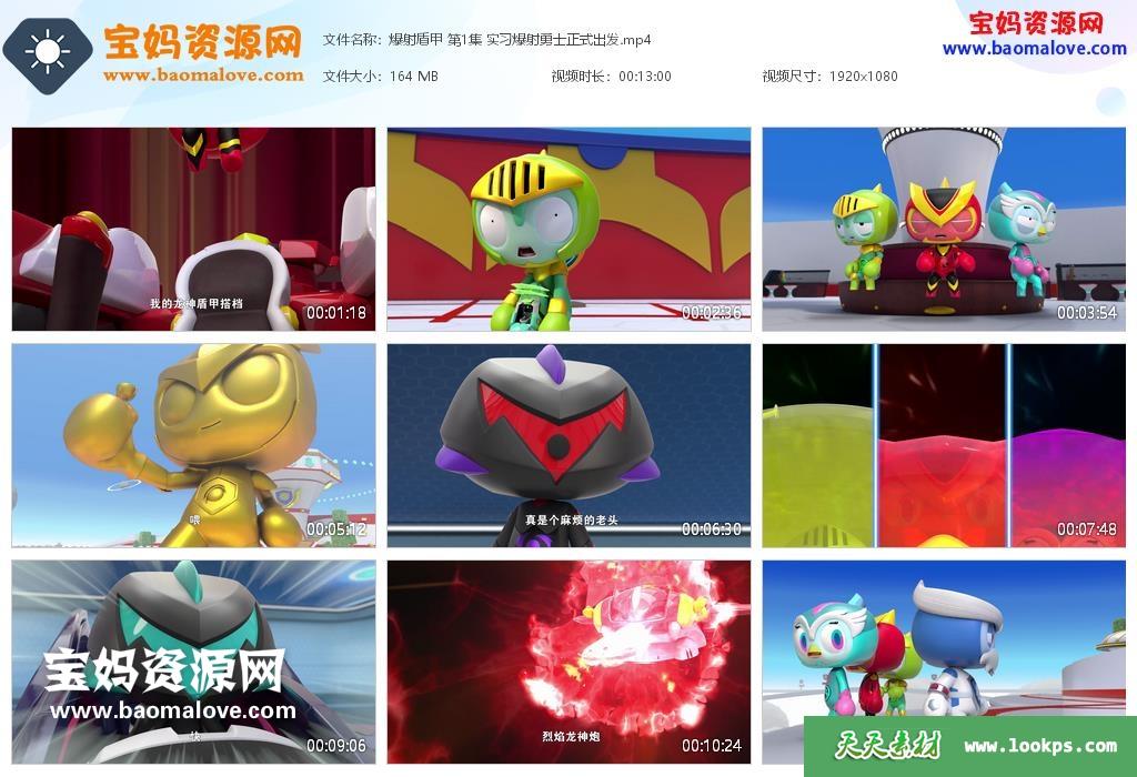 天天资源网收录的动画片《爆射盾甲》 ,全部30集,国语发音,中文字幕;每集大小约155M,资源总大小4.88G,单集播放时长约13分钟,1080P高清MP4格式,可以在电视机或电脑、平板、IPAD、早教机、手机等各种设备播放,提供百度云网盘下载。