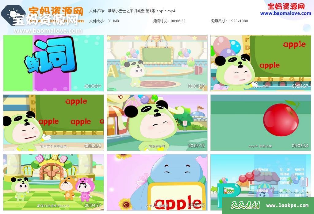 天天资源网收录的动画片《嘟嘟小巴士之单词城堡》 ,全部80集,国语发音,中文字幕;每集大小约35M,资源总大小2.92G,单集播放时长约6分钟,1080P高清MP4格式,可以在电视机或电脑、平板、IPAD、早教机、手机等各种设备播放,提供百度云网盘下载。