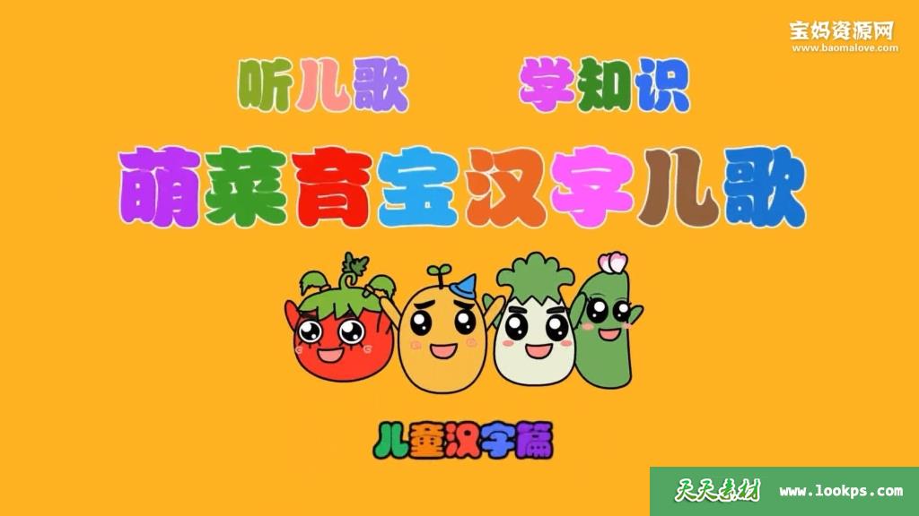 天天资源网收录的动画片《萌菜育宝汉字儿歌》 ,全部62集,国语发音,中文字幕;每集大小约40M,资源总大小2.94G,单集播放时长约3~4分钟,1080P高清MP4格式,可以在电视机或电脑、平板、IPAD、早教机、手机等各种设备播放,提供百度云网盘下载。