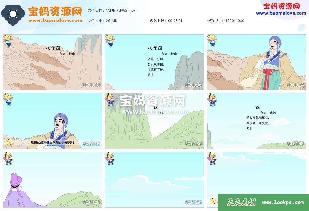 天天资源网收录的动画片《小笨熊之唐诗三百首》 ,全部86集,国语发音,中文字幕;每集大小约35M,资源总大小3.4G,单集播放时长约3分钟,1080P高清MP4格式,可以在电视机或电脑、平板、IPAD、早教机、手机等各种设备播放,提供百度云网盘下载。