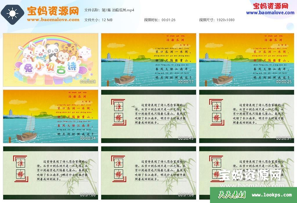 天天资源网收录的动画片《兔小贝古诗》 ,全部137集,国语发音,中文字幕;每集大小约12M,资源总大小1.77G,单集播放时长约1~2分钟,1080P高清MP4格式,可以在电视机或电脑、平板、IPAD、早教机、手机等各种设备播放,提供百度云网盘下载。