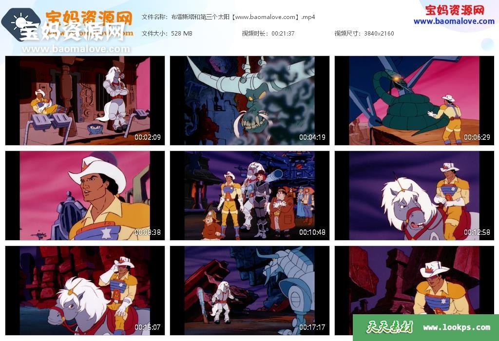 天天资源网收录的动画片《布雷斯塔警长》BraveStarr中文版,全部65集,国语发音,无字幕;每集大小约550M,资源总大小36.7G,单集播放时长约21分钟,2160P高清MP4格式,可以在电视机或电脑、平板、IPAD、早教机、手机等各种设备播放,提供百度云网盘下载。
