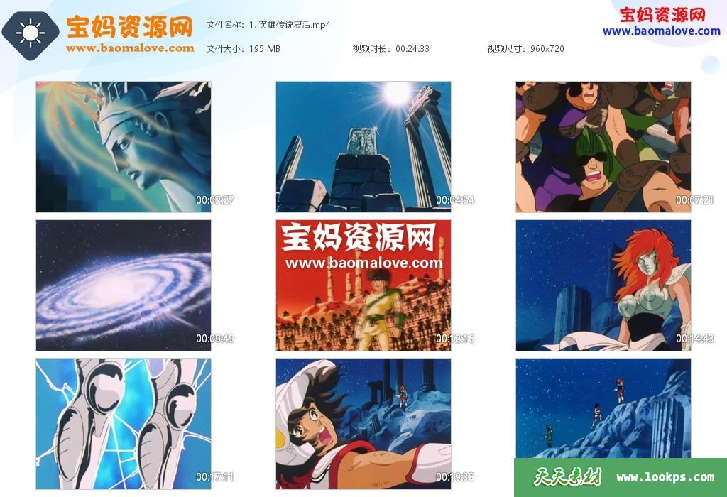 天天资源网收录的动画片《圣斗士星矢》,全部114集,国语发音,无字幕;每集大小约115M,资源总大小13.4G,单集播放时长约24分钟,672P标清MP4格式,可以在电视机或电脑、平板、IPAD、早教机、手机等各种设备播放,提供百度云网盘下载。