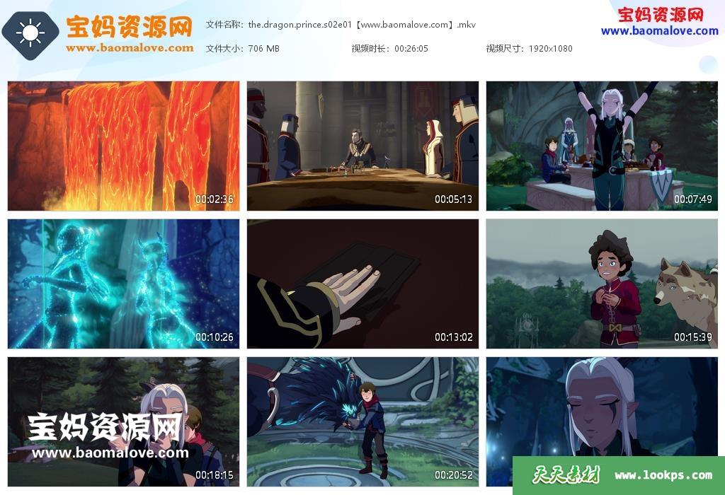 天天资源网收录的动画片《The Dragon Prince》龙王子英文版 第二季,全部9集,英语发音,内置英文字幕(内置多国语言字幕,如葡萄牙文,丹麦文,荷兰文,西班牙文,芬兰文,法文,德文,希腊文,意大利文,挪威文,俄文,西班牙文,瑞典文,土耳其文等,可下载后使用播放器选择设置字幕或者关闭字幕);每集大小约680M,资源总大小6.24G,单集播放时长约24分钟,1080P高清MKV格式,可以在电视机或电脑、平板、IPAD、早教机、手机等各种设备播放,提供百度云网盘下载。