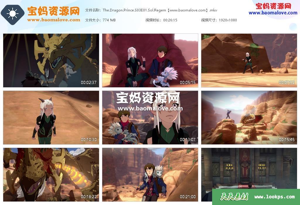 天天资源网收录的动画片《The Dragon Prince》龙王子英文版 第三季,全部9集,英语发音,内置英文字幕(内置多国语言字幕,如简体中文,繁体中文,葡萄牙文,丹麦文,荷兰文,西班牙文,芬兰文,法文,德文,希腊文,意大利文,挪威文,俄文,西班牙文,瑞典文,土耳其文等,可下载后使用播放器选择设置字幕或者关闭字幕);每集大小约680M,资源总大小6.67G,单集播放时长约26分钟,1080P高清MKV格式,可以在电视机或电脑、平板、IPAD、早教机、手机等各种设备播放,提供百度云网盘下载。