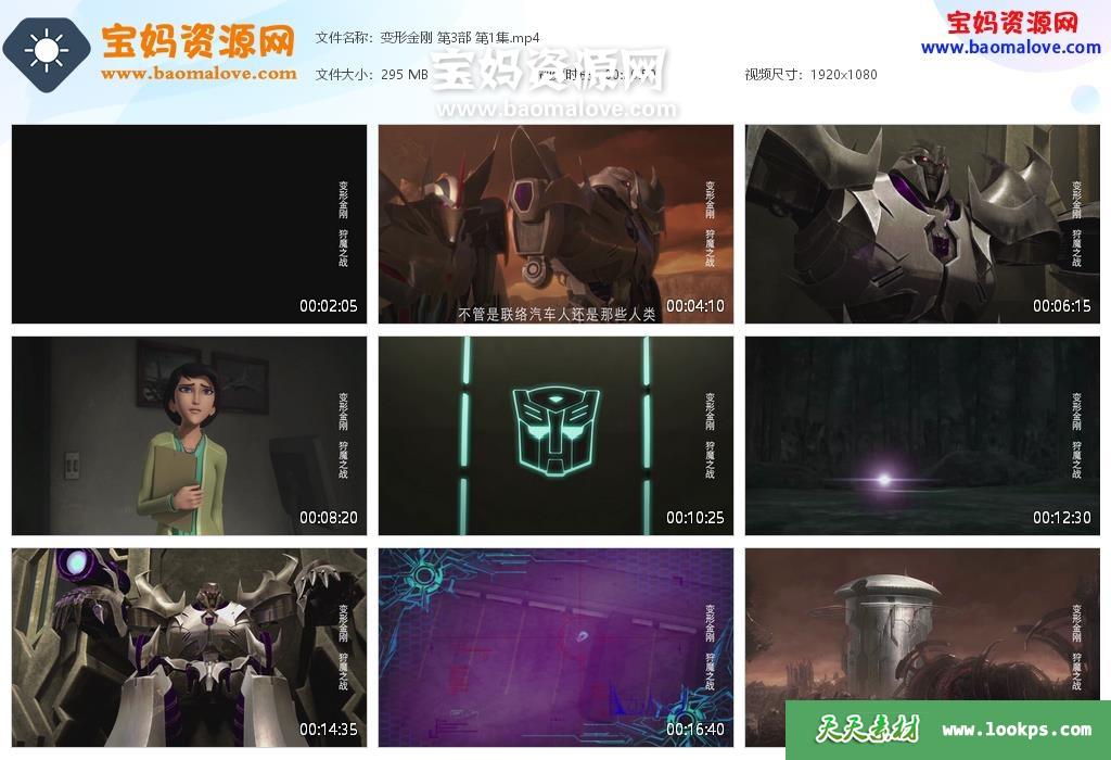 天天资源网收录的动画片《变形金刚:领袖之证》Transformers Prime中文版 第三季,全部13集,国语发音,中文字幕;每集大小约239M,资源总大小4.23G,单集播放时长约21分钟,1080P高清MP4格式,可以在电视机或电脑、平板、IPAD、早教机、手机等各种设备播放,提供百度云网盘下载。