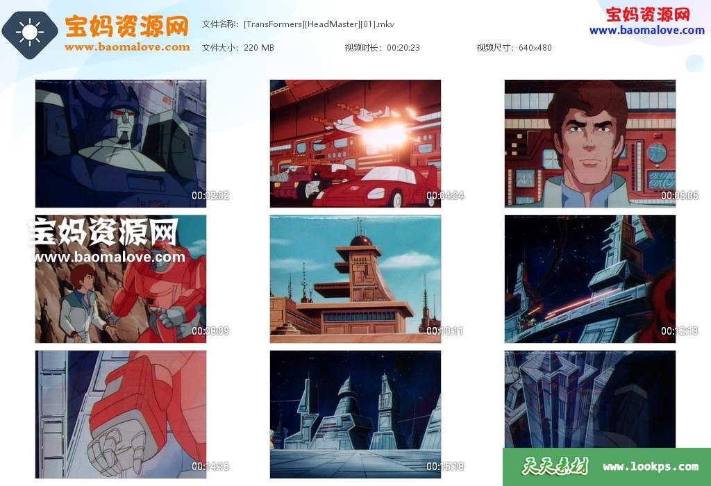 天天资源网收录的动画片《变形金刚:头领战士 Transformers: The Headmasters》,全部35集,国日英三语发音,内置中英文字幕;每集大小222M,资源总大小8.09G,单集播放时长约21分钟,480P标清MKV格式,可以在电视机或电脑、平板、IPAD、早教机、手机等各种设备播放,提供百度云网盘下载。