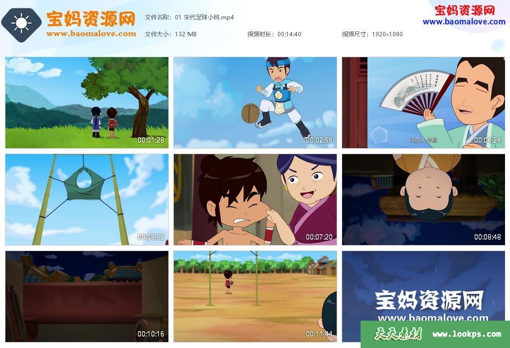 天天资源网收录的动画片《宋代足球小将》,全部40集,国语发音,中文字幕;每集大小约120M,总大小4.79G,单集播放时长约14分钟,1080P高清MP4格式,可以在电视机或电脑、平板、IPAD、早教机、手机等各种设备播放,提供百度云网盘下载。