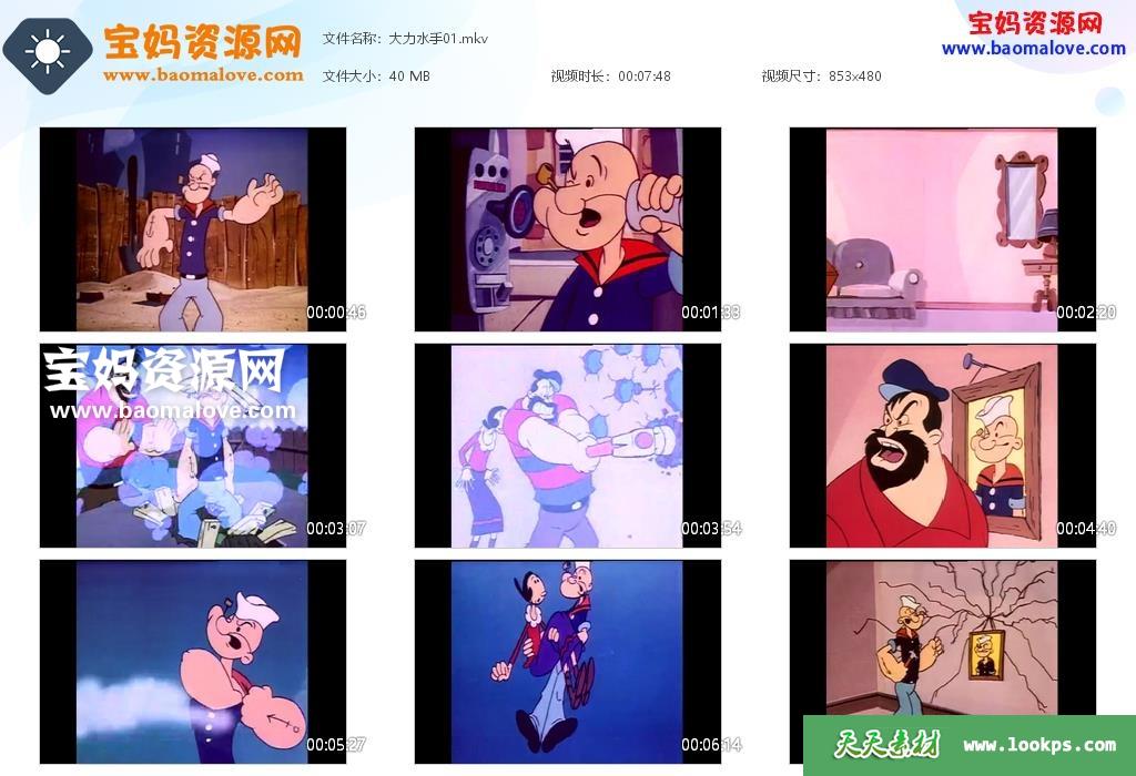 天天资源网收录的动画片《大力水手 Popeye》,全部50集,国英双语发音,无字幕;每集大小40M,资源总大小2.16G,单集播放时长约7~13分钟,480P标清MKV格式,可以在电视机或电脑、平板、IPAD、早教机、手机等各种设备播放,提供百度云网盘下载。