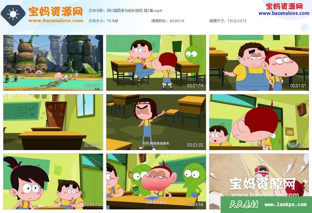 天天资源网收录的动画片《阿U第四季为成长加优》,全部60集,国语发音,中文字幕;每集大小约72M,资源总大小4.45G,单集播放时长约6分钟,1080P高清MP4格式,可以在电视机或电脑、平板、IPAD、早教机、手机等各种设备播放,提供百度云网盘下载。