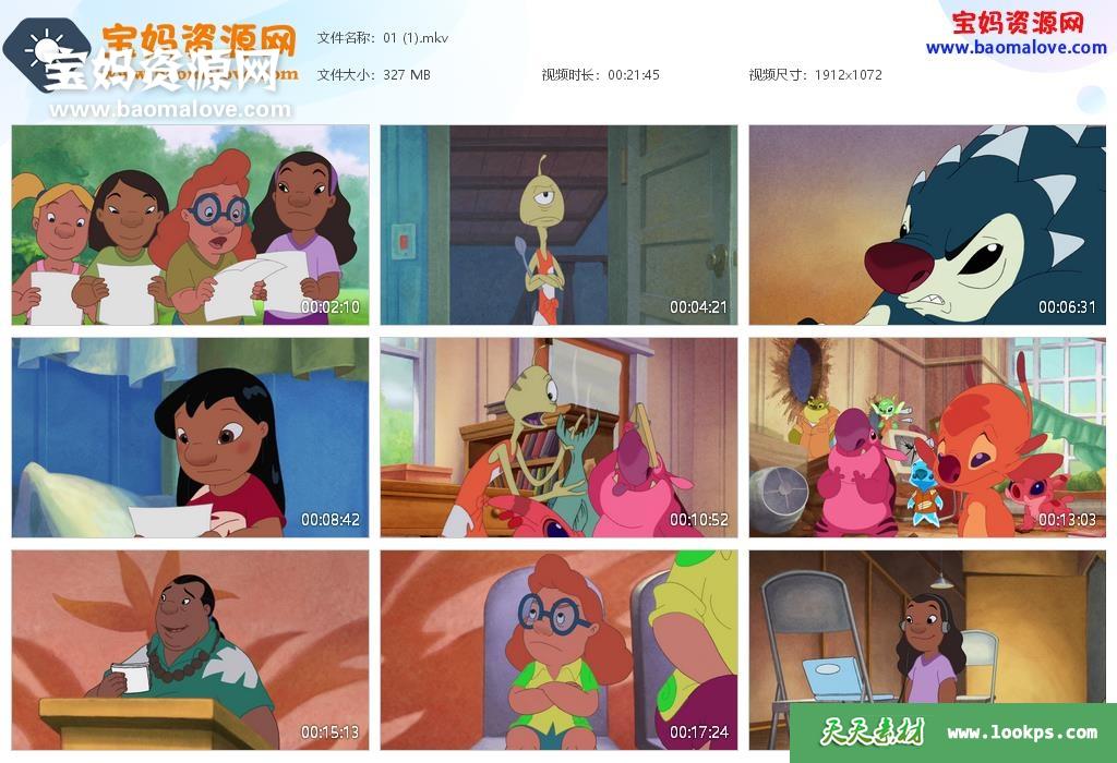 天天资源网收录的动画片《星际宝贝 Lilo & Stitch: The Series》第二季,全部26集,台配国语/央视国语/英语发音,无字幕;每集大小320M,资源总大小8.34G,单集播放时长约21分钟,1080P高清MKV格式,可以在电视机或电脑、平板、IPAD、早教机、手机等各种设备播放,提供百度云网盘下载。