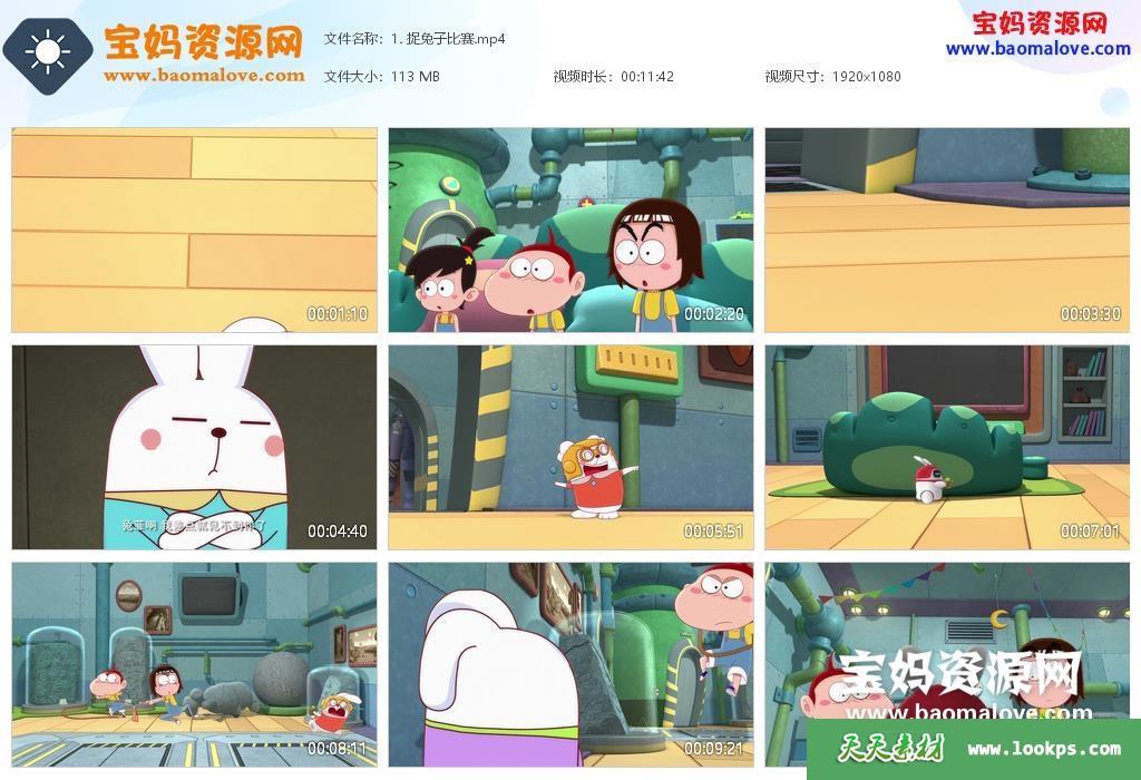 天天资源网收录的动画片《阿U第九季兔智来了2》,全部26集,国语发音,中文字幕;每集大小约95M,资源总大小2.52G,单集播放时长约11分钟,1080P高清MP4格式,可以在电视机或电脑、平板、IPAD、早教机、手机等各种设备播放,提供百度云网盘下载。