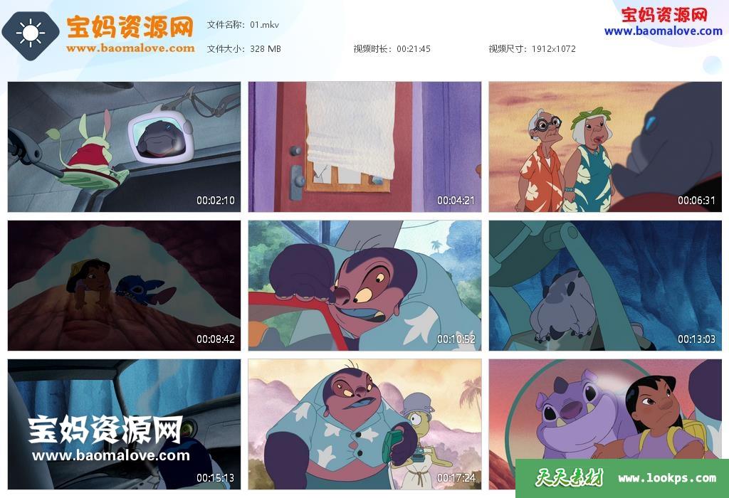 天天资源网收录的动画片《星际宝贝 Lilo & Stitch: The Series》第一季,全部39集,台配国语/央视国语/英语发音,无字幕;每集大小320M,资源总大小12.4G,单集播放时长约21分钟,1080P高清MKV格式,可以在电视机或电脑、平板、IPAD、早教机、手机等各种设备播放,提供百度云网盘下载。