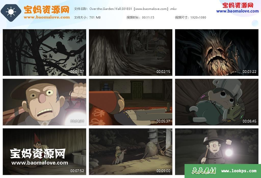 天天资源网收录的动画片《Over the Garden Wall》花园墙外英文版 第一季,全部10集,英语发音音轨和英语解说音轨(可切换音轨),内置英文字幕(可以下载后使用播放器选择设置字幕或者关闭字幕);每集大小约700M,资源总大小9.29G,单集播放时长约11分钟,1080P高清MKV格式,可以在电视机或电脑、平板、IPAD、早教机、手机等各种设备播放,提供百度云网盘下载。