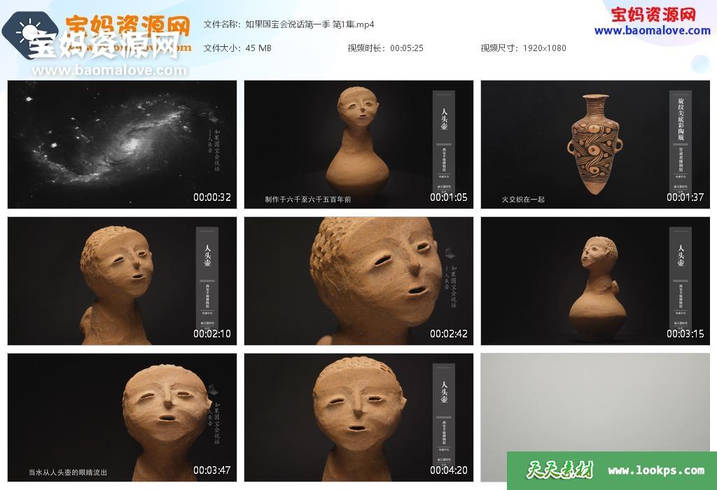 天天资源网收录的纪录片《如果国宝会说话》第一季,全部25集,国语发音,中文字幕;每集大小约60M,资源总大小1.68G,单集播放时长约5分钟,1080P高清MP4格式,可以在电视机或电脑、平板、IPAD、早教机、手机等各种设备播放,提供百度云网盘下载。