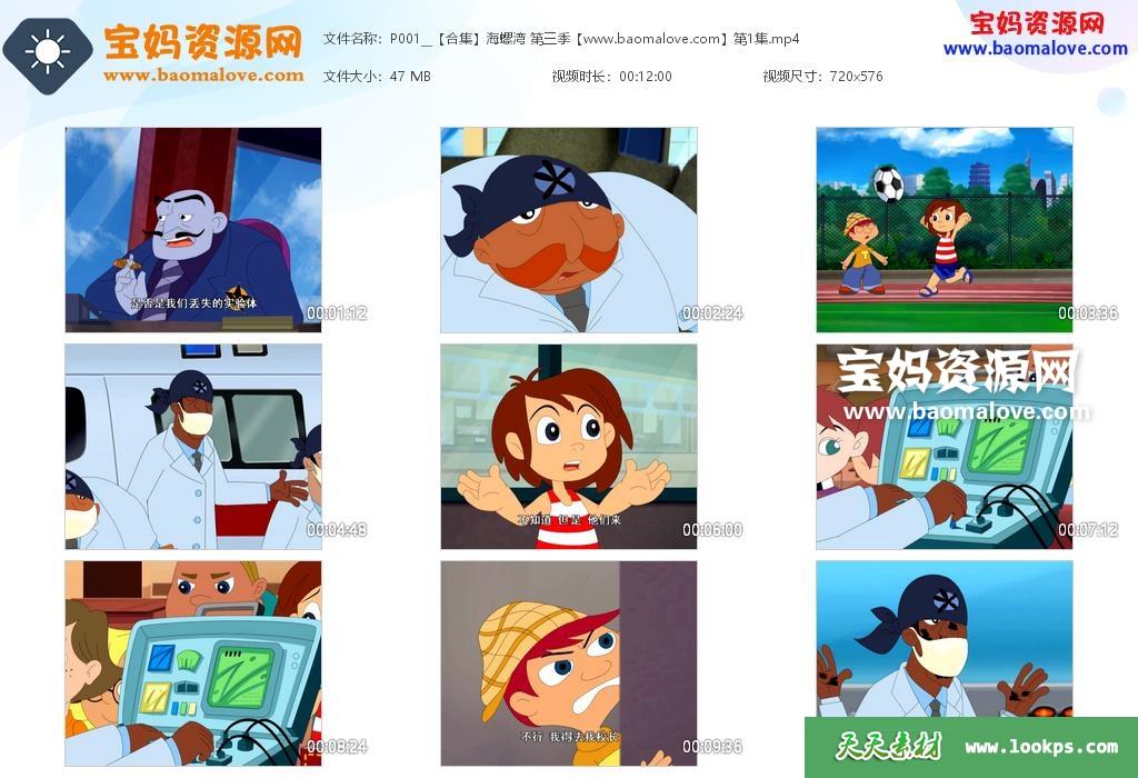 天天资源网收录的动画片《海螺湾》第一二三季,全部130集,国语发音,中文字幕;每集大小约50M,资源总大小6.5G,单集播放时长约12分钟,576P标清MP4格式,可以在电视机或电脑、平板、IPAD、早教机、手机等各种设备播放,提供百度云网盘下载。