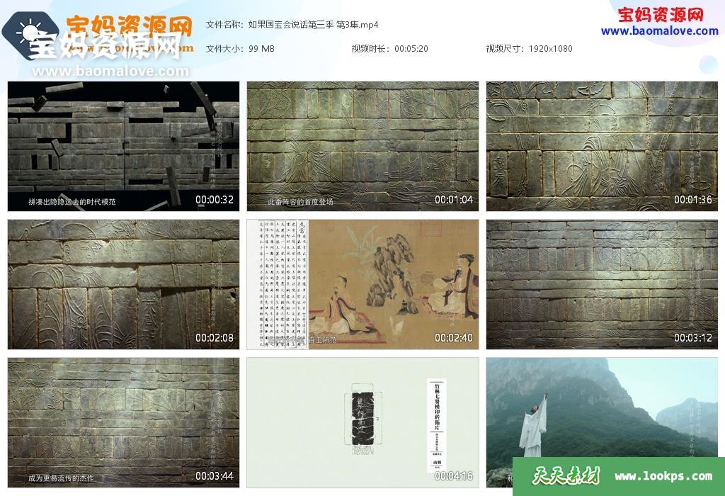 天天资源网收录的纪录片《如果国宝会说话》第三季,全部25集,国语发音,中文字幕;每集大小约75M,资源总大小2.09G,单集播放时长约5分钟,1080P高清MP4格式,可以在电视机或电脑、平板、IPAD、早教机、手机等各种设备播放,提供百度云网盘下载。