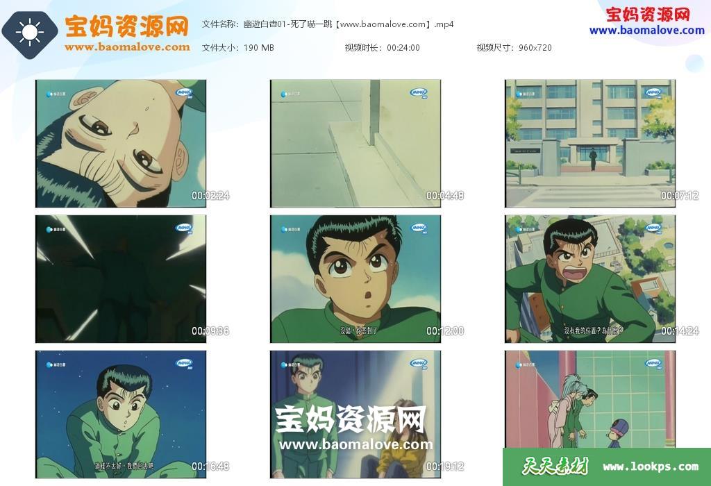 天天资源网收录的动画片《幽游白书》,全部112集,国语发音,中文字幕;每集大小约180M,资源总大小20.2G,单集播放时长约24分钟,720P高清MP4格式,可以在电视机或电脑、平板、IPAD、早教机、手机等各种设备播放,提供百度云网盘下载。