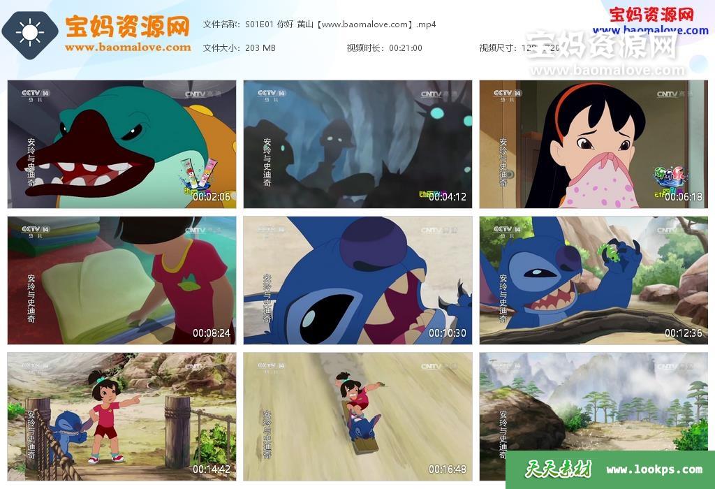 天天资源网收录的动画片《星际宝贝:安玲与史迪奇》,全部13集,国语发音,无字幕;每集大小约190M,资源总大小2.56G,单集播放时长约21分钟,720P高清MP4格式,可以在电视机或电脑、平板、IPAD、早教机、手机等各种设备播放,提供百度云网盘下载。