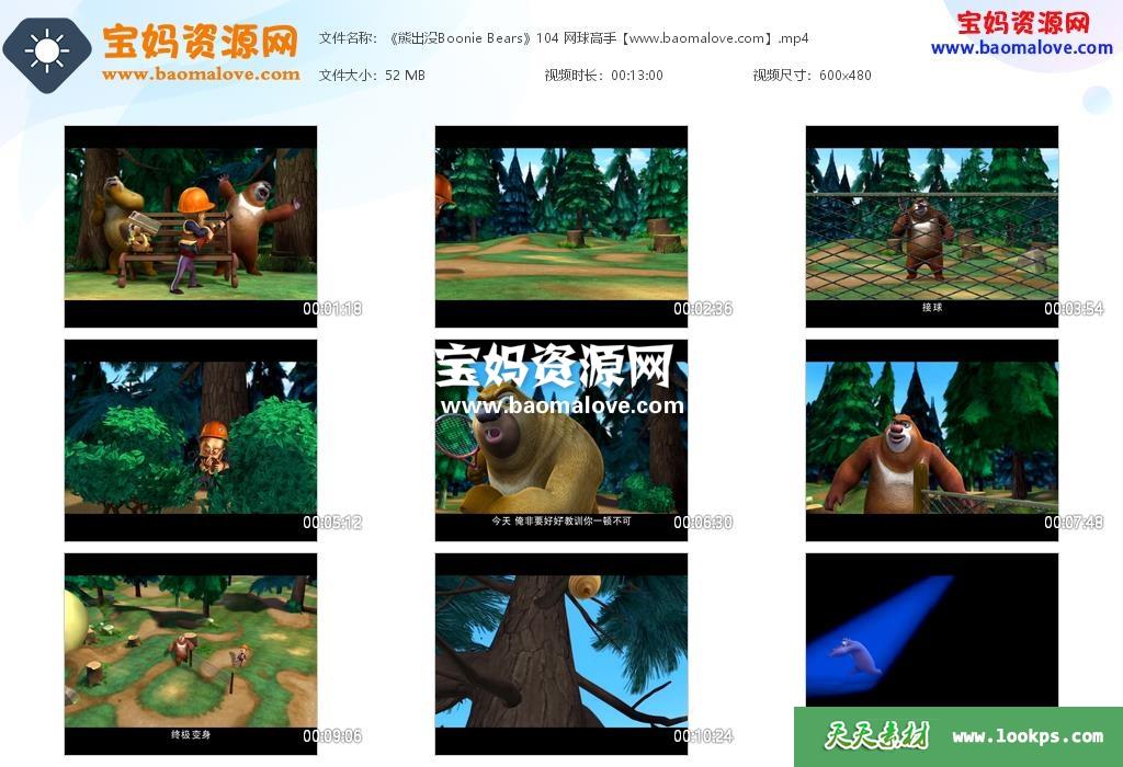 天天资源网收录的动画片《熊出没》第一季,全部104集,国语发音,中文字幕;每集大小约55M,总大小6.02G,单集播放时长约13分钟,480P标清MP4格式,可以在电视机或电脑、平板、IPAD、早教机、手机等各种设备播放,提供百度云网盘下载。