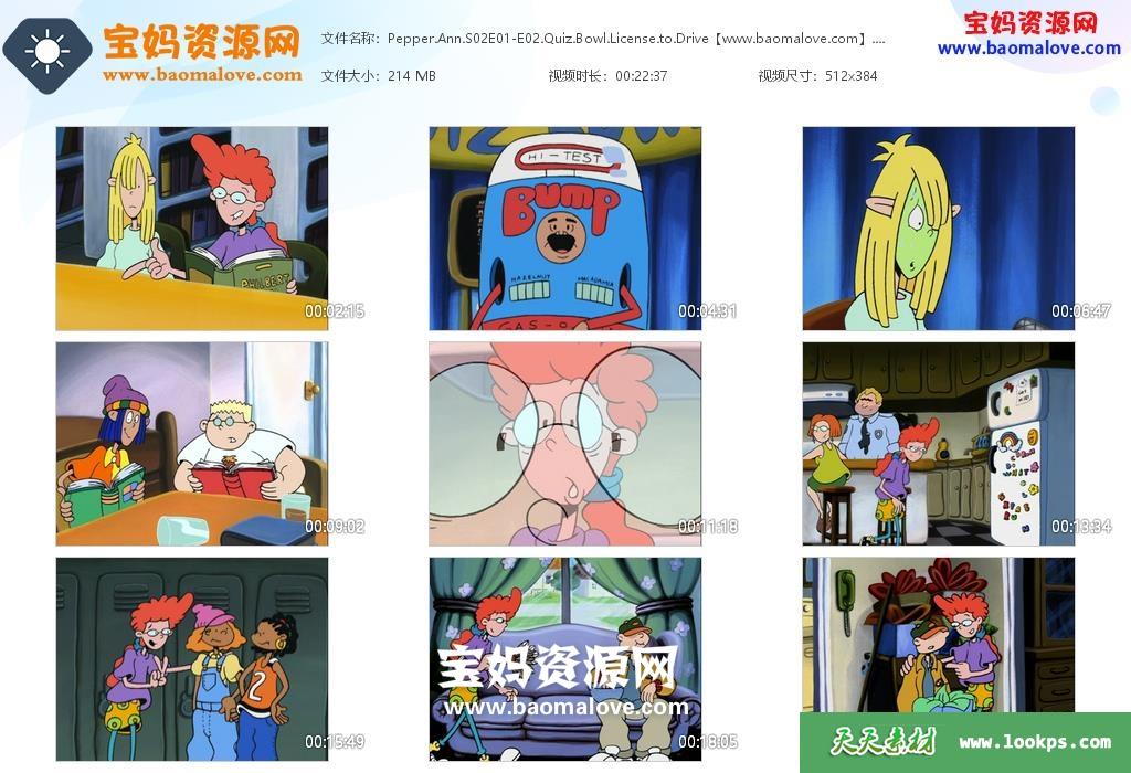 天天资源网收录的动画片《Pepper Ann》波波安英文版 第二季,全部25集,英语发音,内置英文字幕(可下载后使用播放器选择设置字幕或者关闭字幕);每集大小105M,资源总大小2.71G,单集播放时长约11分钟,384P标清MKV格式,可以在电视机或电脑、平板、IPAD、早教机、手机等各种设备播放,提供百度云网盘下载。