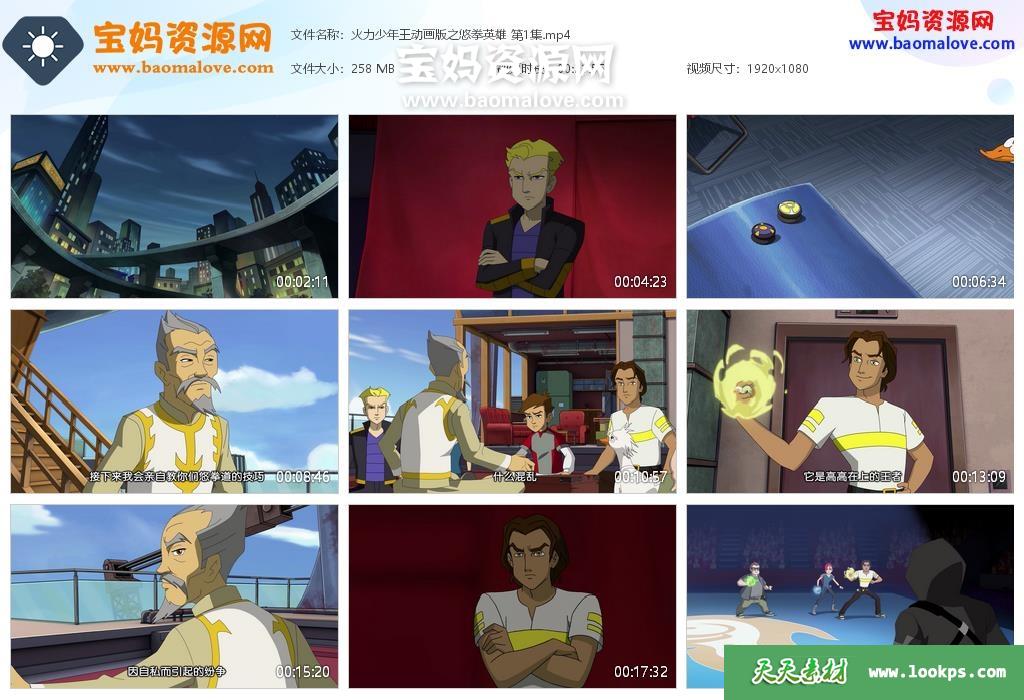 天天资源网收录的动画片《火力少年王动画版之悠拳英雄》,全部42集,国语发音,中文字幕;每集大小约260M,资源总大小11.4G,单集播放时长约22分钟,1080P高清MP4格式,可以在电视机或电脑、平板、IPAD、早教机、手机等各种设备播放,提供百度云网盘下载。