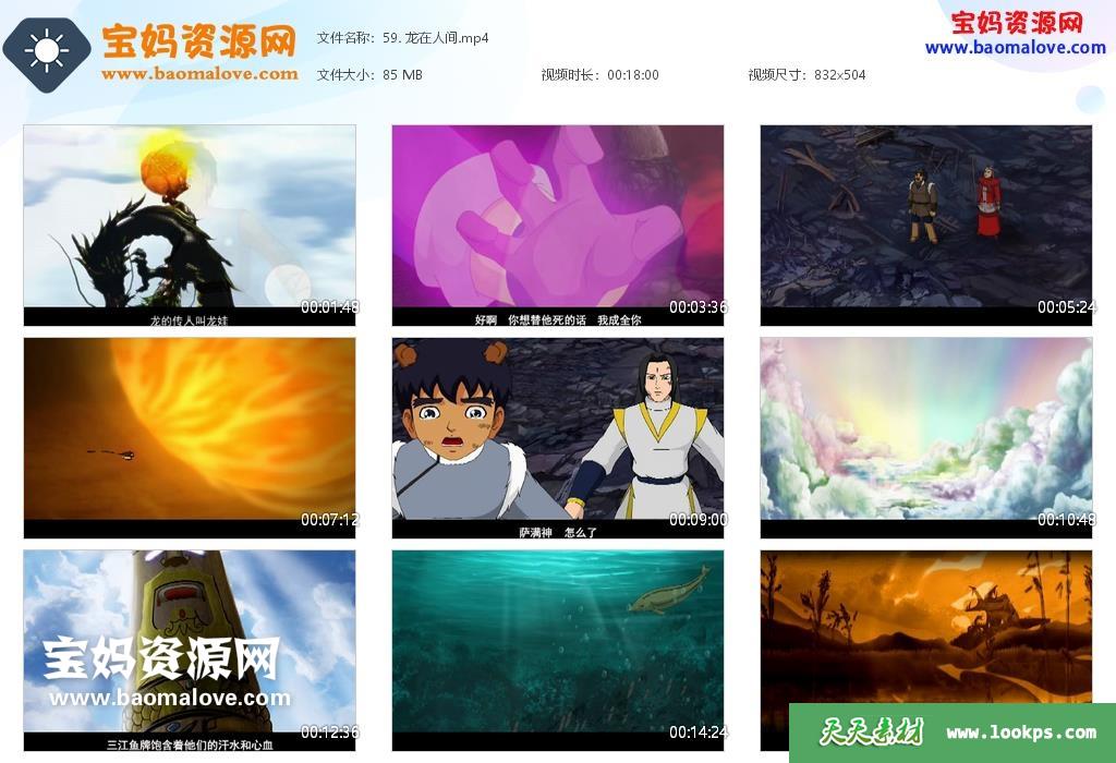 天天资源网收录的动画片《龙娃》,全部59集,国语发音,中文字幕;每集大小约80M,资源总大小4.93G,单集播放时长约18分钟,504P标清MP4格式,可以在电视机或电脑、平板、IPAD、早教机、手机等各种设备播放,提供百度云网盘下载。