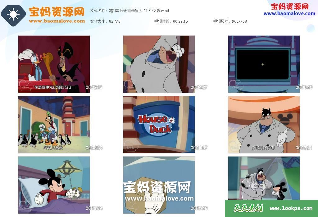 天天资源网收录的动画片《米老鼠群星会》Disney’s House of Mouse中文版,全部52集,国语发音,中文字幕;每集大小约75M,资源总大小3.93G,单集播放时长约22分钟,768P高清MP4格式,可以在电视机或电脑、平板、IPAD、早教机、手机等各种设备播放,提供百度云网盘下载。