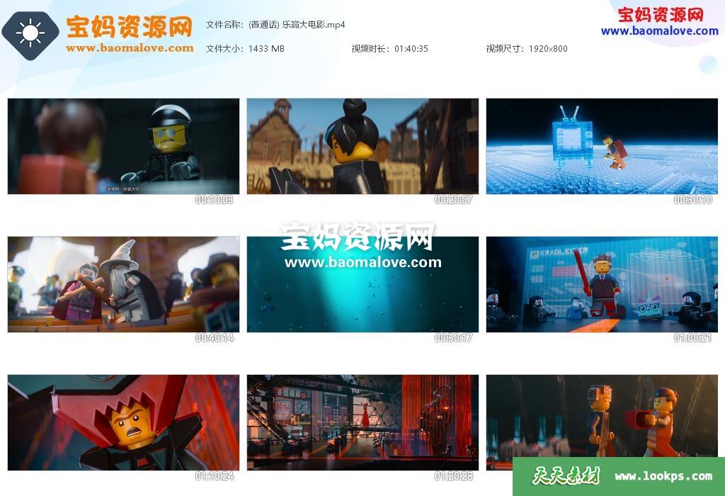 天天资源网收录的动画电影《乐高大电影 The Lego Movie》,国语发音,中文字幕;资源大小约1.39G,播放时长约100分钟,800P高清MP4格式,可以在电视机或电脑、平板、IPAD、早教机、手机等各种设备播放,提供百度云网盘下载。