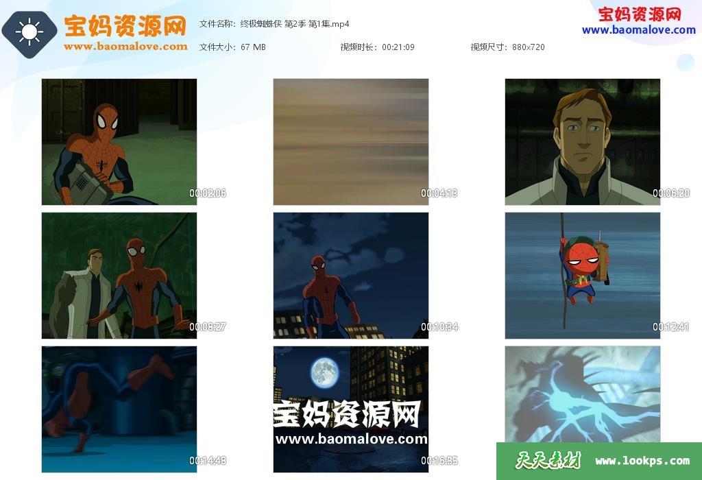 天天资源网收录的动画片《终极蜘蛛侠》Ultimate Spider-Man中文版 第二季,全部26集,国语发音,无字幕;每集大小约63M,资源总大小1.75G,单集播放时长约21分钟,720P高清MP4格式,可以在电视机或电脑、平板、IPAD、早教机、手机等各种设备播放,提供百度云网盘下载。