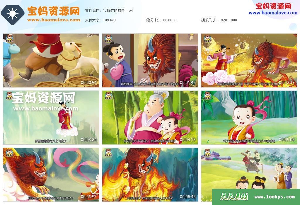天天资源网收录的动画片《宝宝童书之中国传统节日故事》 ,全部12集,国语发音,中文字幕;资源总大小1.25G,单集播放时长约8~12分钟,1080P高清MP4格式,可以在电视机或电脑、平板、IPAD、早教机、手机等各种设备播放,提供百度云网盘下载。