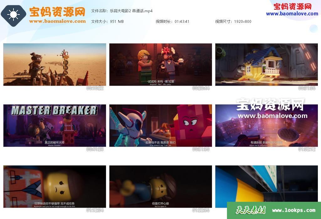 天天资源网收录的动画电影《乐高大电影2 The Lego Movie 2: The Second Part》,国语发音,中英文字幕;资源大小约951M,播放时长约103分钟,800P高清MP4格式,可以在电视机或电脑、平板、IPAD、早教机、手机等各种设备播放,提供百度云网盘下载。