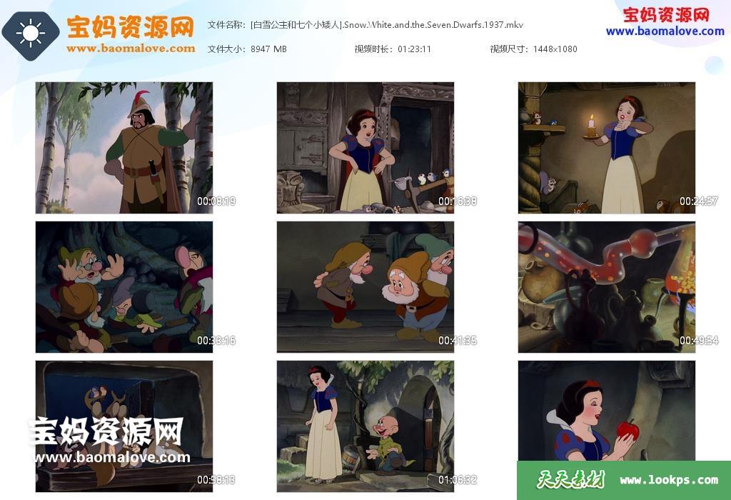 天天资源网收录的动画电影《白雪公主和七个小矮人 Snow White and the Seven Dwarfs》,国粤台英四语发音,中英文字幕;资源大小约8.73G,1080P高清MKV格式,可以在电视机或电脑、平板、IPAD、早教机、手机等各种设备播放,提供百度云网盘下载。