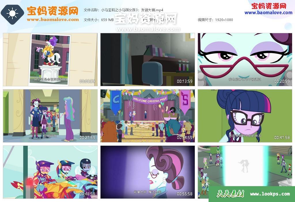天天资源网收录的动画电影《彩虹小马:小马国女孩之友谊大赛 My Little Pony: Equestria Girls – Friendship Games》,国语发音,中文字幕;资源大小约659M,播放时长约70分钟,1080P高清MP4格式,可以在电视机或电脑、平板、IPAD、早教机、手机等各种设备播放,提供百度云网盘下载。
