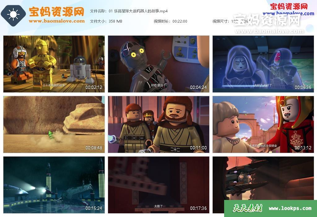 天天资源网收录的动画片《乐高星球大战:尤达编年史》Lego Star Wars:The Yoda Chronicles中文版,全部6集,国语发音,中文字幕;每集大小约330M,资源总大小1.66G,单集播放时长约22分钟,1080P高清MP4格式,可以在电视机或电脑、平板、IPAD、早教机、手机等各种设备播放,提供百度云网盘下载。
