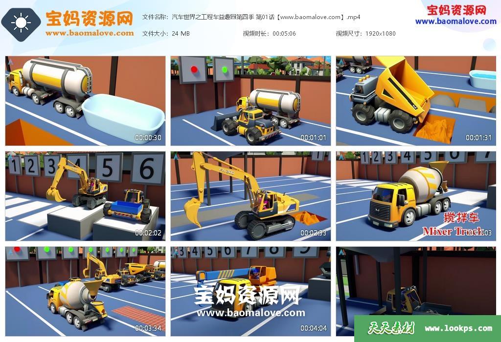 天天资源网收录的动画片《汽车世界之工程车益趣园》第四季,全部42集,国语发音,无字幕;每集大小约25M,总大小1.12G,单集播放时长约3~5分钟,1080P高清MP4格式,可以在电视机或电脑、平板、IPAD、早教机、手机等各种设备播放,提供百度云网盘下载。