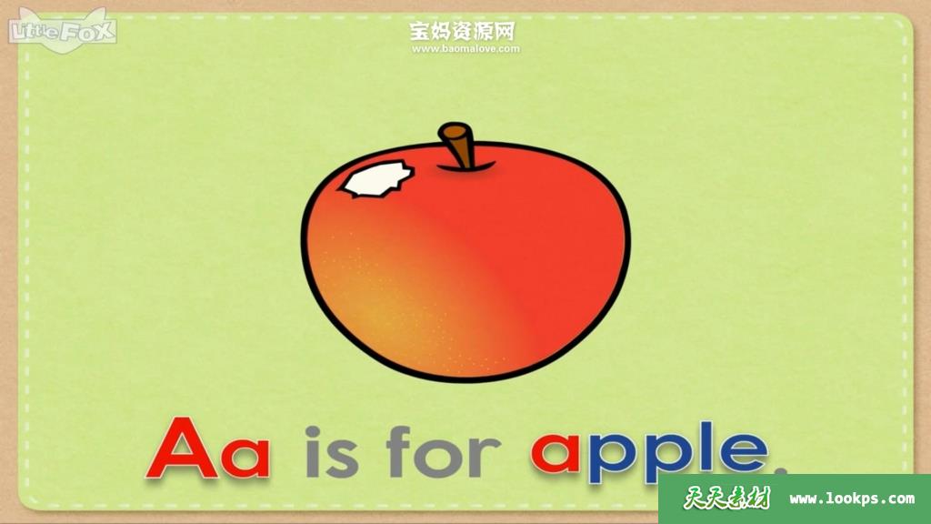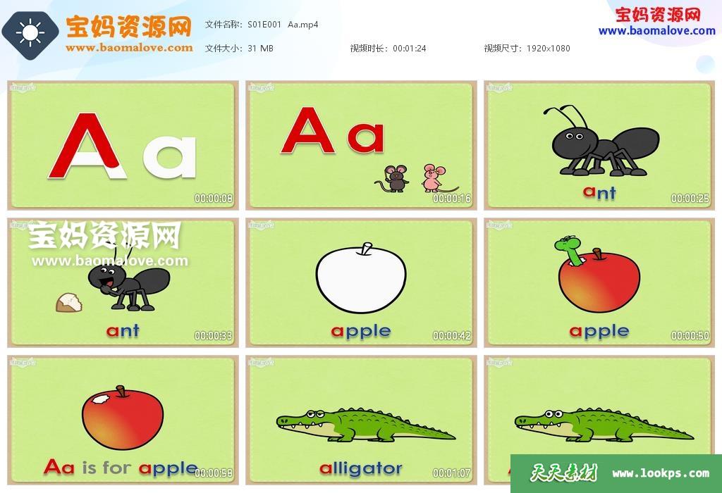 天天资源网收录的动画片《ABC Book》ABC字母书英文版,全部26集,英语发音,外挂英文字幕(可下载后使用播放器选择设置字幕或者关闭字幕);每集大小约30M,资源总大小803M,单集播放时长约1分钟,1080P高清MP4格式,可以在电视机或电脑、平板、IPAD、早教机、手机等各种设备播放,提供百度云网盘下载。