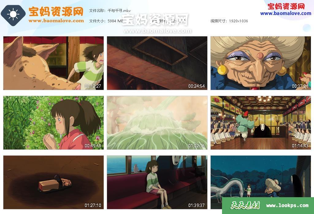 天天资源网收录的动画电影《千与千寻》,台/粤/日/英/法/芬/韩语发音,中文字幕;资源大小约5.84G,1080P高清MKV格式,可以在电视机或电脑、平板、IPAD、早教机、手机等各种设备播放,提供百度云网盘下载。