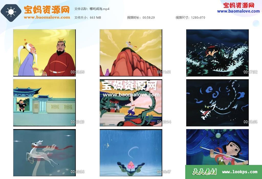 天天资源网收录的动画电影《哪吒闹海》,国语发音,无字幕;资源大小约663M,播放时长约59分钟,970P高清MP4格式,可以在电视机或电脑、平板、IPAD、早教机、手机等各种设备播放,提供百度云网盘下载。